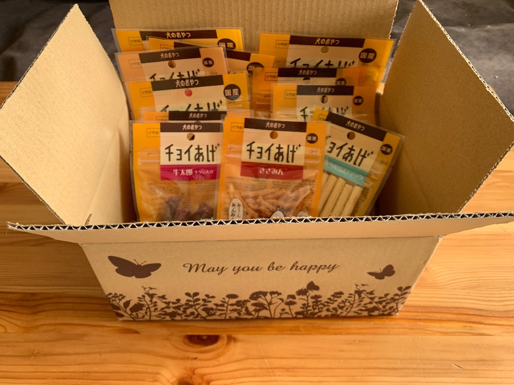 チキンスティック、ビーフジャーキー、牛太郎、ささみん、チキンハワイ、サクサクささみチーズ、ささみコイン、ミルク入りキューブ、豆乳ビスケット、山羊ミルク入りスティック、かつおくん、かぼちゃん、おいもん。